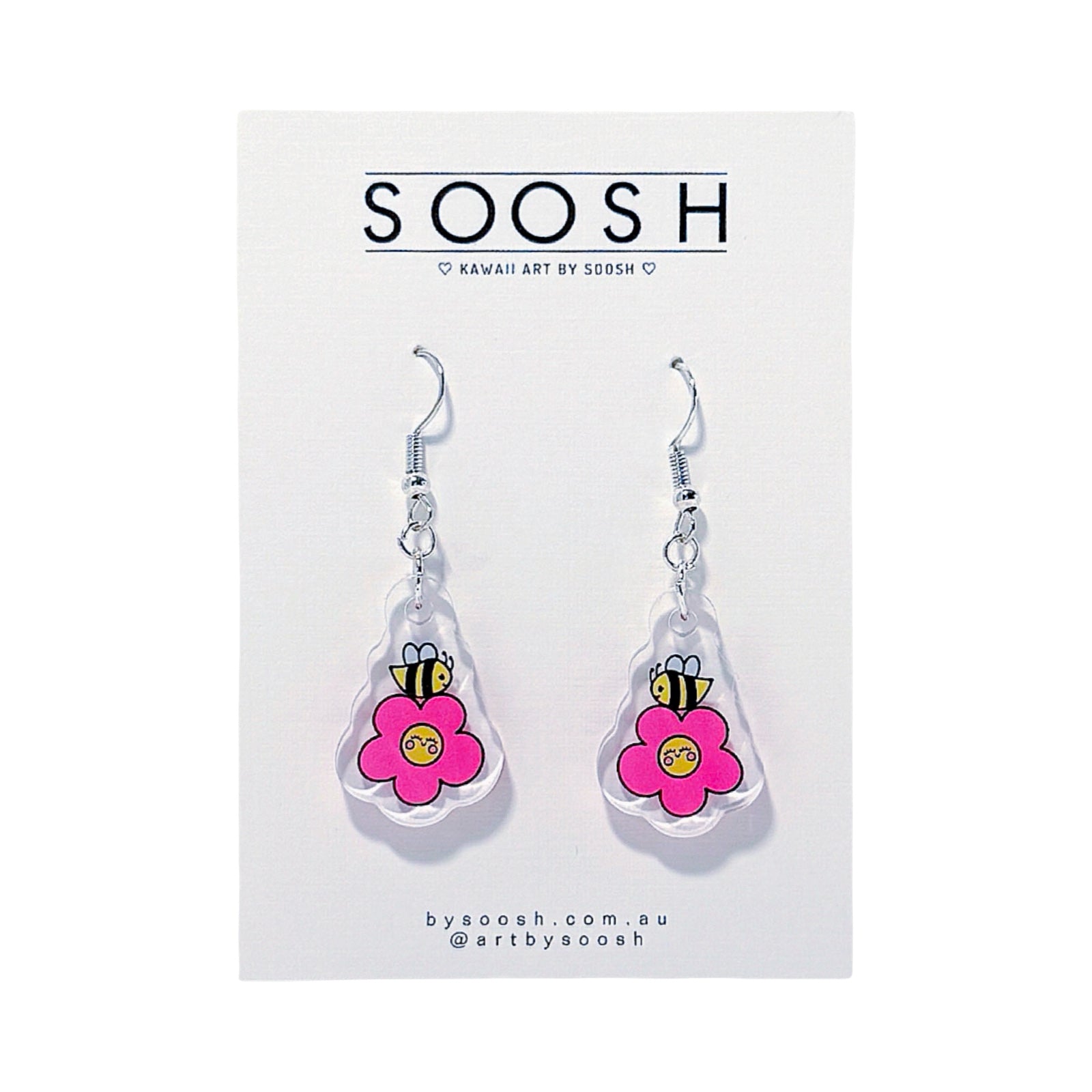 Dreamy Flower and Bee Silver Drop Dangle Acrylic Earrings
